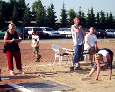 Eltern, Lehrer und Mittelschüler helfen als Kampfrichter. Hier wird Roland Wamser sein Sprung vermessen.