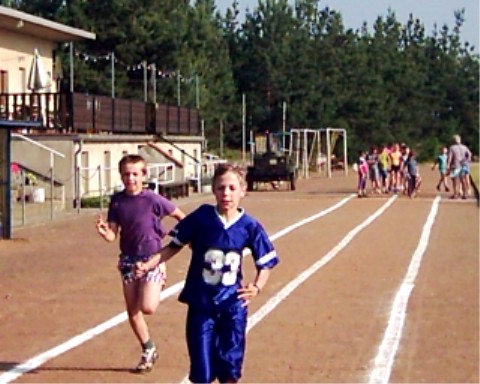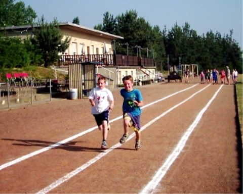 Daniel und Tommy beim 50 m-Lauf Bernd erreicht das Ziel kurz vor Patrick.