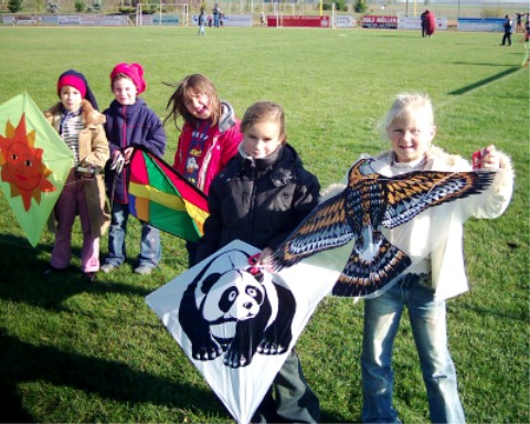 Von links nach rechts einige Kinder der Klasse 2 mit ihren Drachen: Clara, Jasmin, Tina, Nathalie und Virginie.